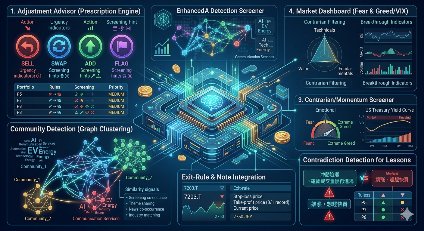每個行動都會附上 urgency(緊急度) 和 screening_hint(尋找方向的提示)。例如「SWAP: 7203.T → 用同產業的value預設尋找替代」這樣,連下一步都會顯示。