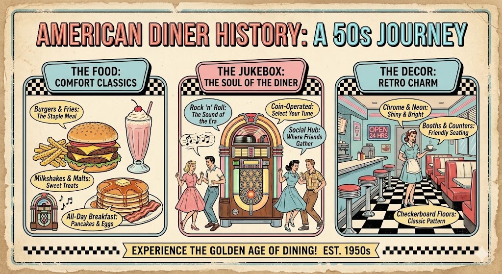 "製作一張復古的、20世紀50年代風格的 infographic,介紹美國餐廳的歷史。內容應包含「食物」、「點唱機」和「裝飾」等不同部分。確保所有文字清晰易讀,並符合當時的風格。"