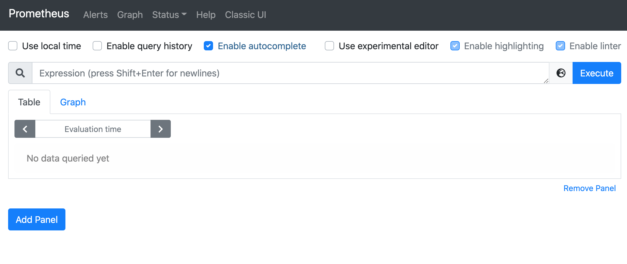 Prometheus 內置了用於 PromQL 查詢的表達式查詢界面,瀏覽器中導航至 http://<host-ip>:9090/graph 並選擇 Table 視圖即可: