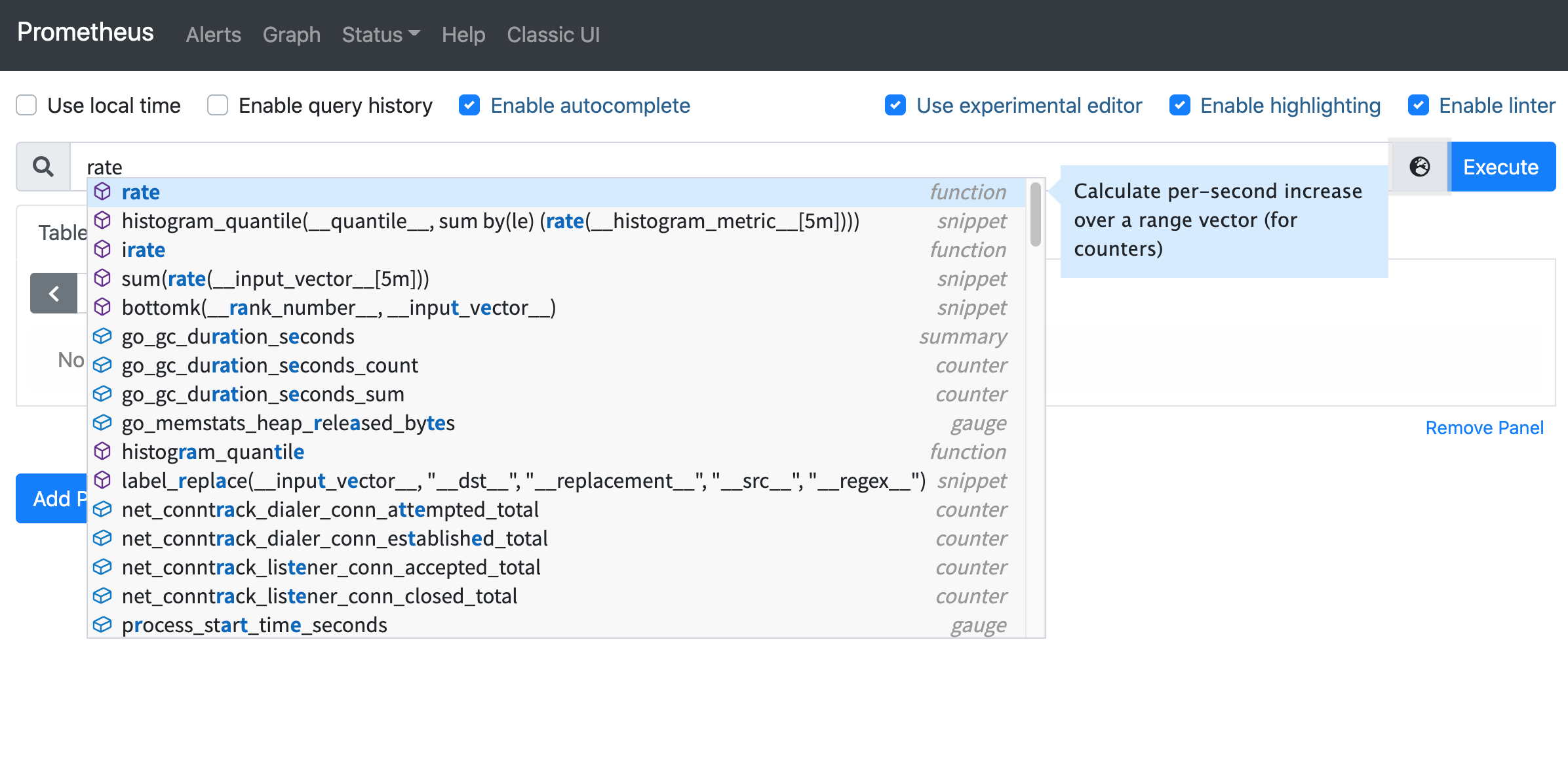 新版本的 Prometheus,還對查詢功能做了大幅度的升級,新增了一個非常實用的功能就是有查詢關鍵字相關的提示了。