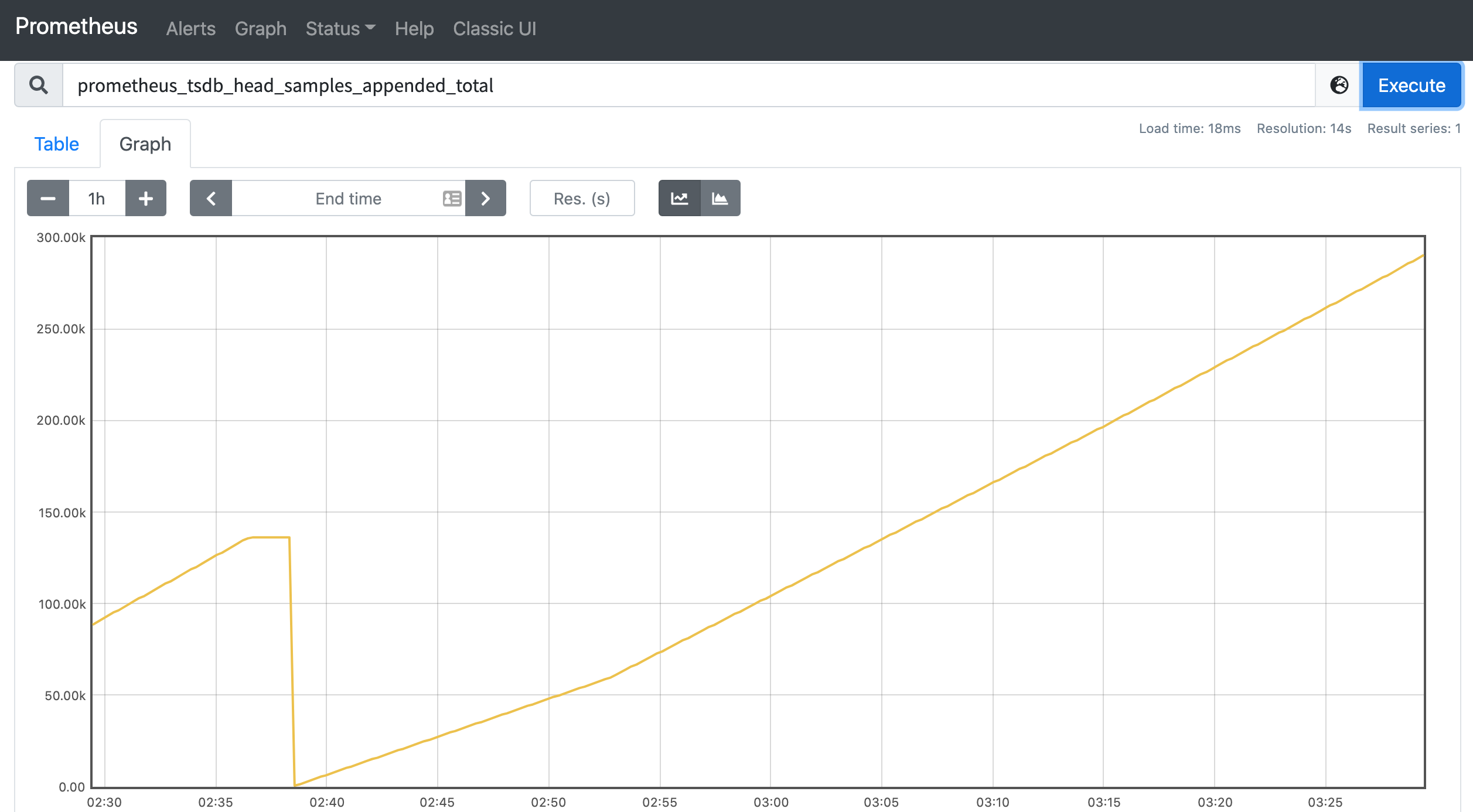 比如我們這裡可以查詢下面的指標,表示自進程開始以來被捉取入 Prometheus 本地存儲中的樣本總數:
